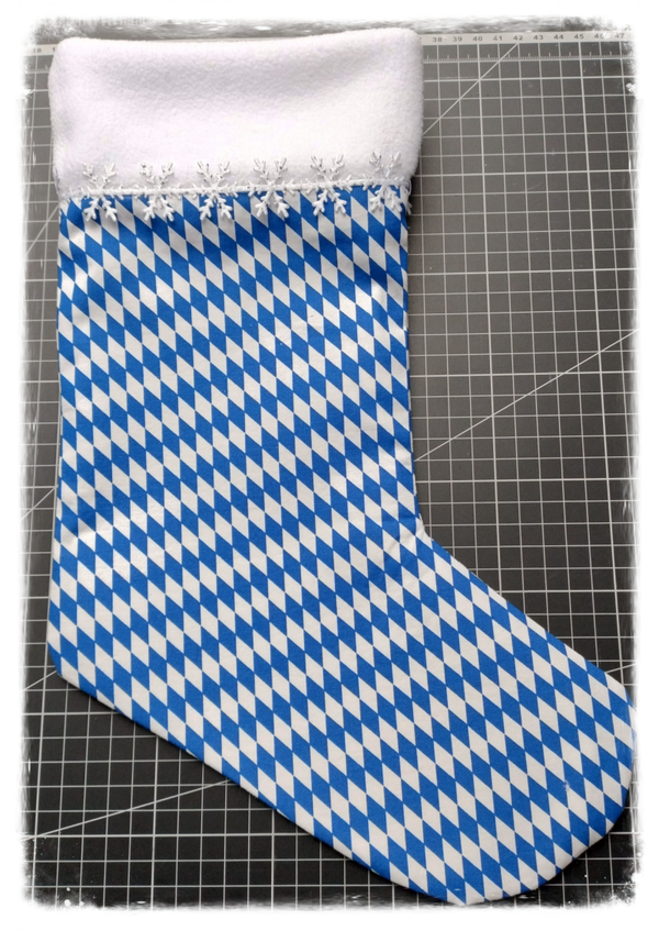 Bringe bayerische Farben in Deine Weihnachtsdekoration! Dieser einzigartige Nikolausstiefel ist ein liebevoll gefertigtes Unikat im "Mia-san-Mia" Design. Er vereint festliche Tradition mit stolzer, weiß-blauer Eleganz.