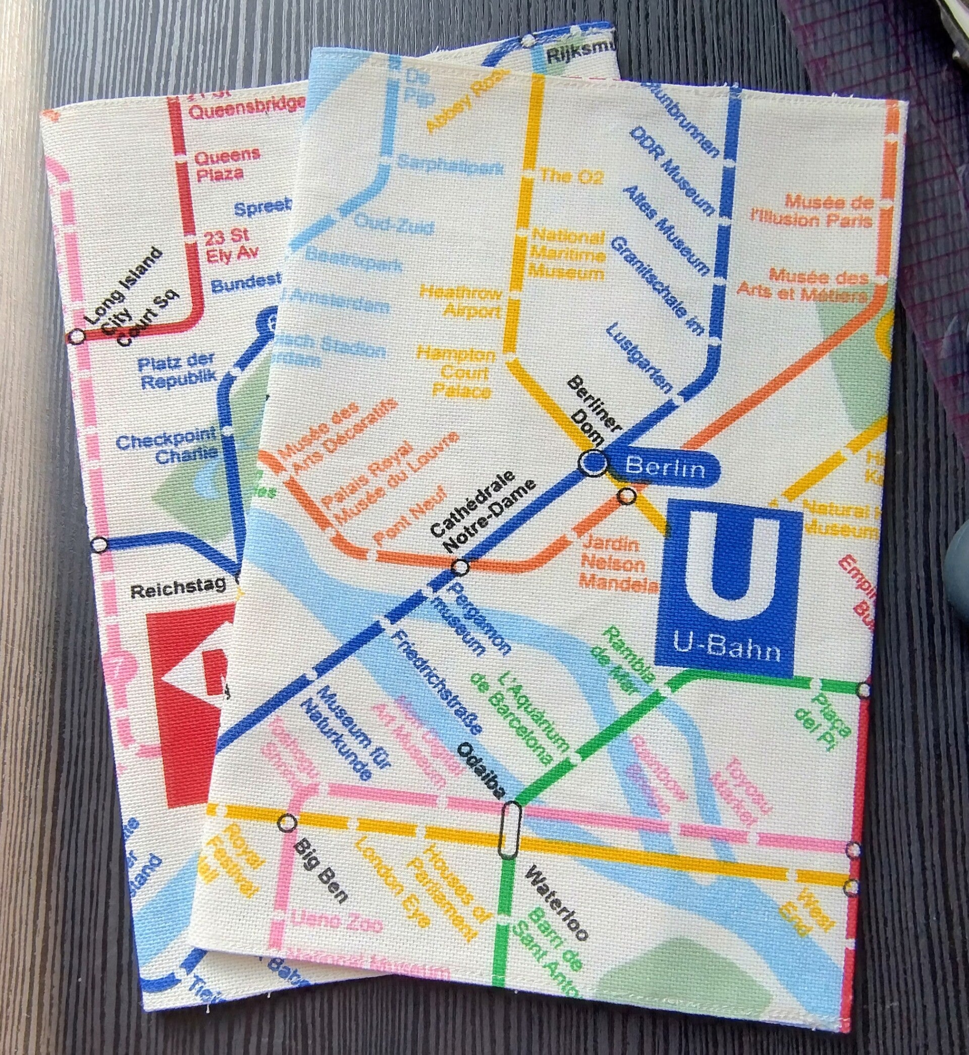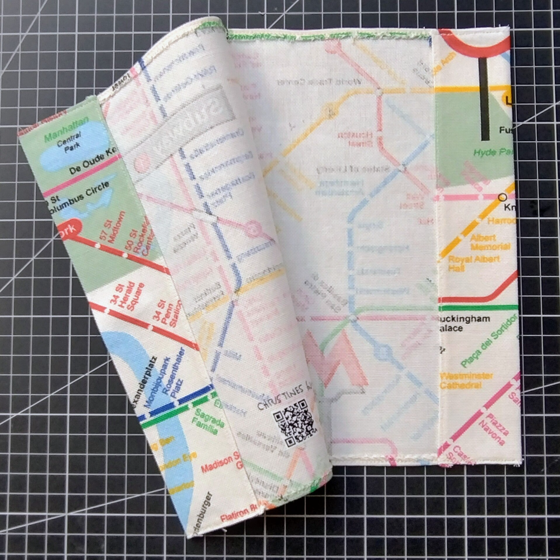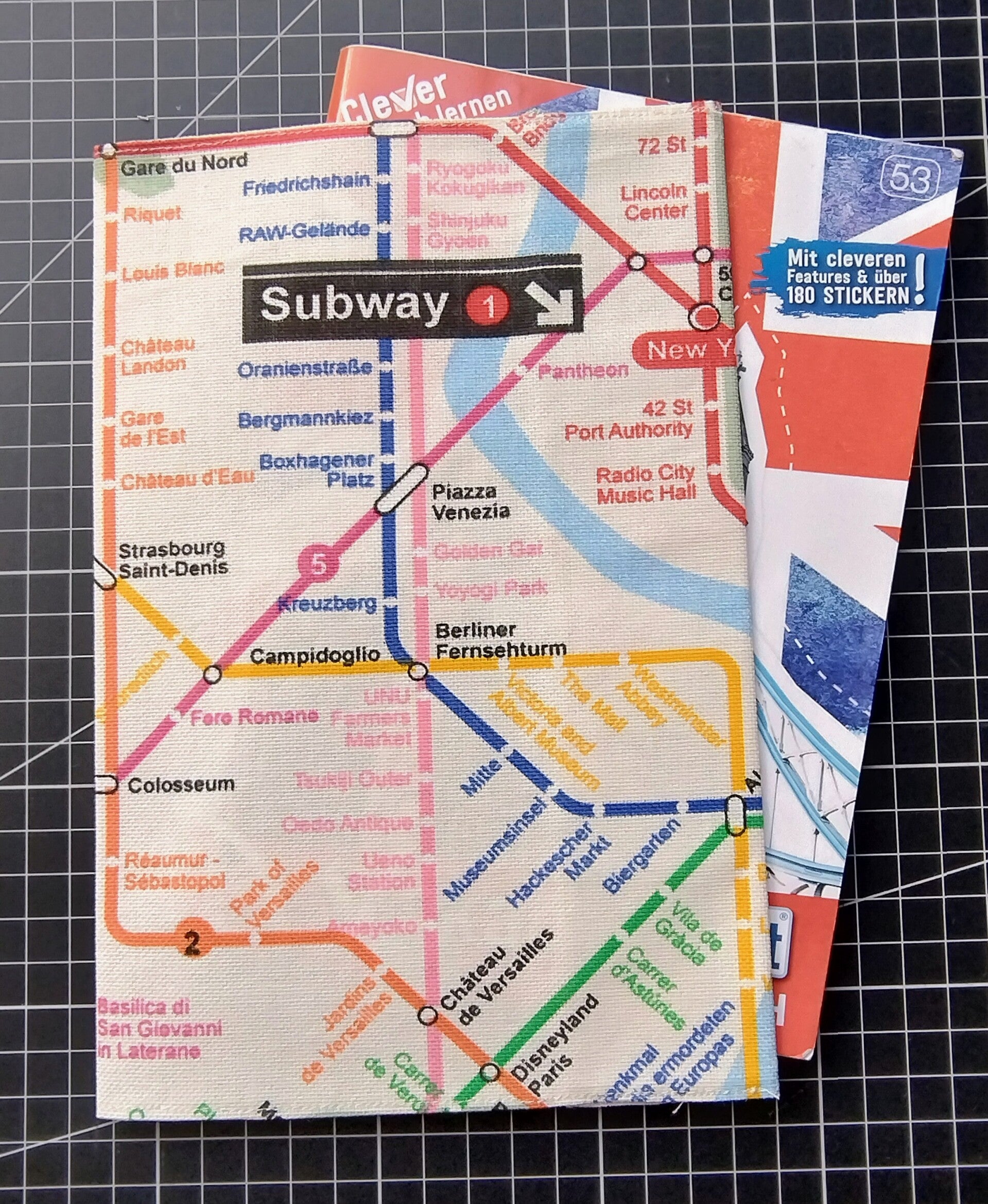 Jeder Umschlag eine eigene Reise: Da der Stoffballen mit einem fortlaufenden Muster der U-Bahn Linien bedruckt ist, sieht kein Umschlag exakt aus wie der andere. Je nach Zuschnitt landen mal mehr Berliner oder Londoner Linien, mal mehr New Yorker oder Tokioer Linien auf deinem Cover. Das bedeutet: Dein Umschlag ist ein echtes Unikat, das es so kein zweites Mal gibt! 👍
